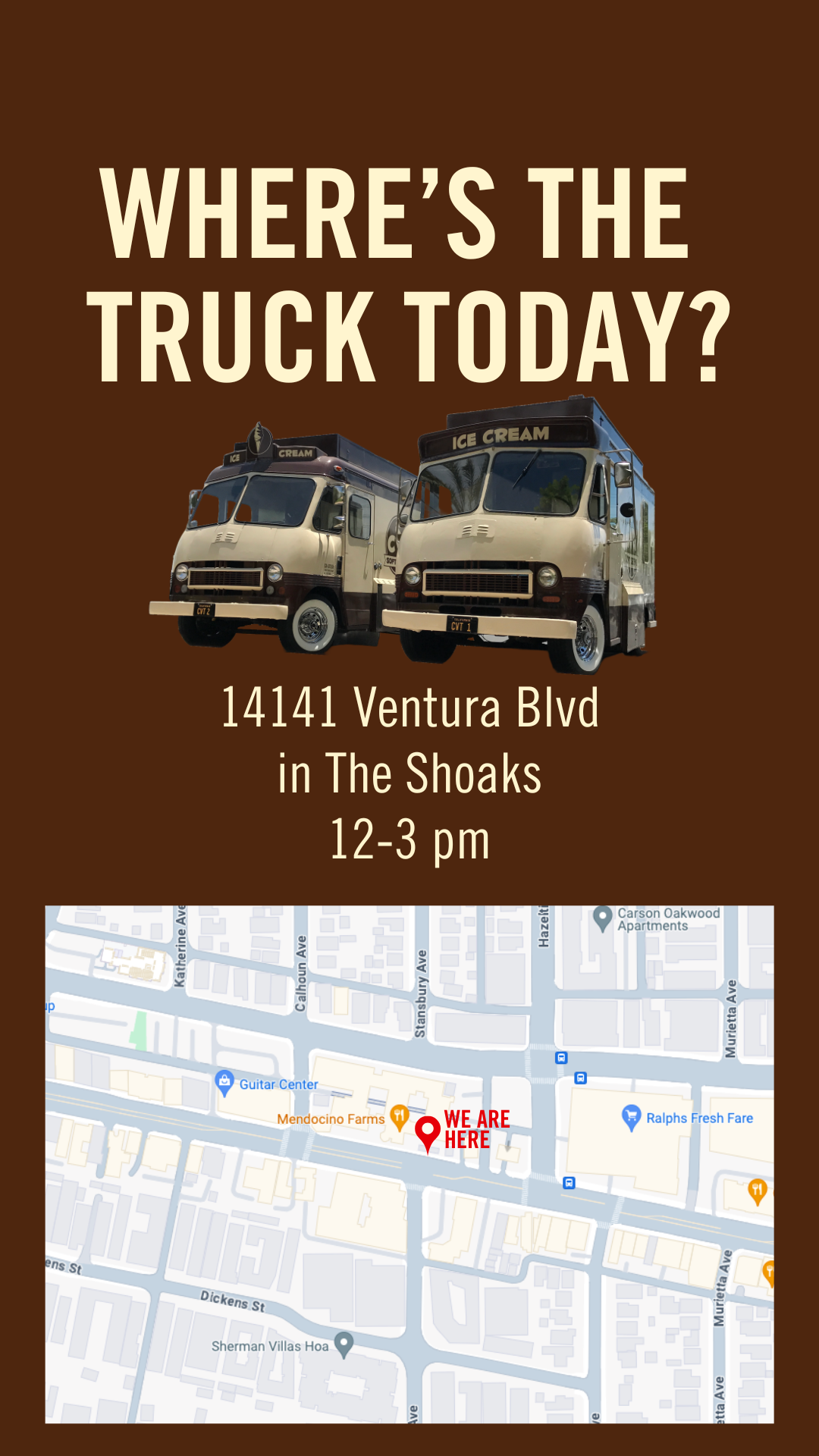 We'll be serving it up today at 14141 Ventura Blvd in The Shoaks from 12-4, & 5-9. See ya!